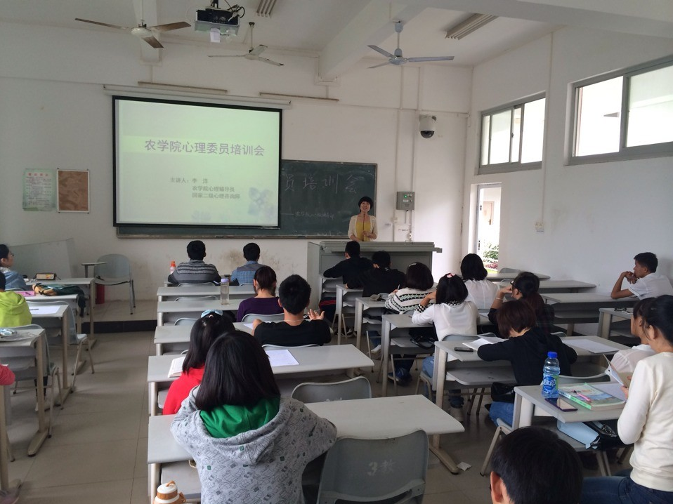 为提高班级心理委员业务水平,发挥心理委员在学院心理健康教育工作中的重要作用,2013年11月17日下午3点半,农学院心理委员培训会在3号教学楼304教室举行。培训会由学院心理辅导员、国家二级心理咨询师李洋老师主讲,各班心理委员参加了培训。