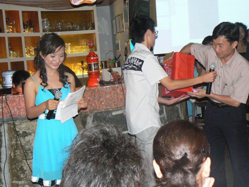 赛后,学工办主任王老师和“十大歌手”在BBS酒吧前合影!国交院“音乐盛典”——2008国交院“十大歌手”决赛随着西下的夕阳一同落幕!
