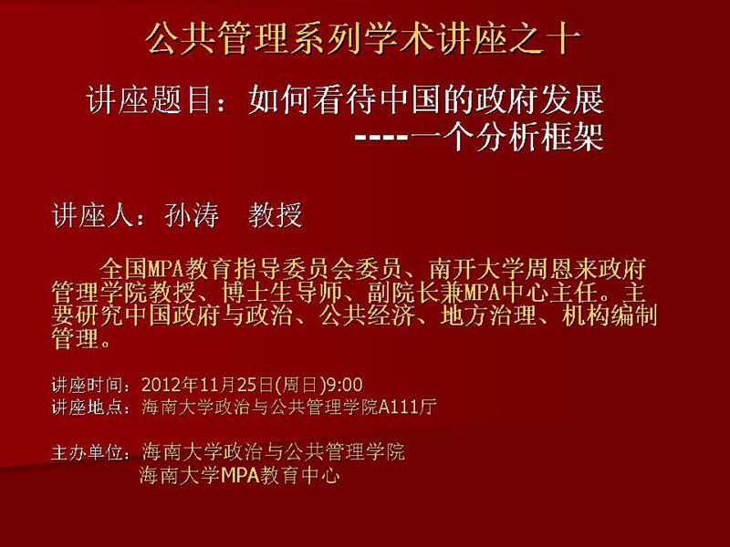 2012年11月25日上午,全国MPA教育指导委员会委员,南开大学周恩来政府管理学院博士生导师、副院长兼MPA中心主任孙涛教授在学院A111多功能报告厅为pa集团官网入口师生作了一场以“如何看待中国政府发展——一个分析框架”为主题的学术报告会。本场报告会由政管学院江红义博士主持,近百名师生一同聆听。