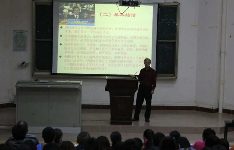 宋增伟教授首先对党在国家历史中取得的重大成就和历史经验作了深入探讨,得出高举中国特色社会主义伟大旗帜是党和人民取得伟大成就的根本原因的深刻结论。接着,宋教授向师生们介绍了党的十八大的基本内容。他从中国文化、中国智慧的角度,对十八大报告的特点、意义、新提法、主题词与关键词、主要内容与主要精神、主要亮点与主要创新等方面继续解读了十八大精神,并结合海南国际旅游岛建设和海南绿色崛起的战略目标,引导师生党员要树立远大的理想信念,自觉将党的十八大精神与具体学习工作相结合,为国家和海南国际旅游岛建设作出应有的贡献。宋教授风趣而又生动的讲演营造了良好的气氛,现场师生认真听取、细致思考,受益匪浅。