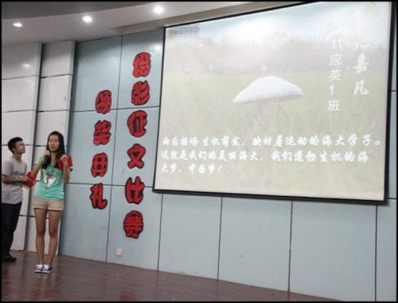 获得摄影奖项的同学分别上台领奖并向观众阐述了他们作品的理念。其中,来自09级人文传播学院的应验同学谈到了本次摄影比赛让他再一次关注校园,再一次去回忆自己的大学生活,而这也将成为他大学四年难忘的一个回忆。而范嘉凡同学对于其作品内容所包含的中国梦的内涵的阐述也是赢得了在场观众的阵阵掌声。中场休息时赵姝婷同学一曲《隐形的翅膀》将颁奖典礼现场的气氛带向了一个新的高潮。随后进行的是征文比赛的颁奖。同样的,同学们也都纷纷结合海大实际阐述了中国梦对自己的意义。