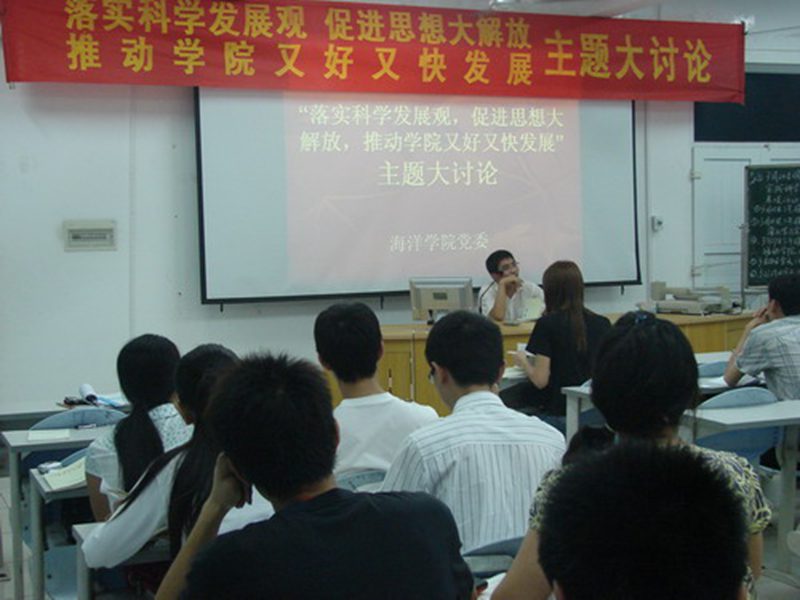 2009年3月27日晚上8:00,海洋学院四楼报告厅坐满了学生党员,海洋学院团委书记王林桂老师、学工办李丽老师一起与学生进行讨论。主题讨论会由王林桂老师主持。 主题讨论会由研究生开始,带动大家积极发言。研究生代表谈到要实现学院又好又快发展,本科生和研究生这两个主体要真正解放思想,实事求是。本研侧重点不同,本科生主要是学习基础知识,但要多读书,多实践,培养创新思维;而研究生则主要进行科学研究,提高实验水平,创新研究思路,才能实现个人的又好又快发展,个人发展了,学院才能发展。 大四党员代表结合自己求职过程中遇到的困难和社会大环境带来的就业压力给非毕业班的同学提了几点建议:第一,要进行正确自我认知与和合理评价,从底层开始,树立榜样,寻求发展。。第二,有思想才会有行动,思想是让心静化与净化的过程。态度决定一切,端正态度,发现不足,改进缺点;第三,金融危机不是灾难,是机遇和挑战,要把握机会,迎接挑战。 06制药的曾南春以《跟着党走,开放,改革》为题,分别对开放和改革与在座的党员交流了自己的看法。第一,学院发展就要加强对外交流合作,拓宽视野,个人发展靠加强沟通,广交朋友,增长见识。第二,改革是大胆创新,对于学院来说,学生是主体,要改进学习生活方法,而教师要改进教学工作方法;二者相互促进,协调发展,学院才能又好又快发展。第三,个人要发展就要解放思想,摆正心态,心态决定命运。