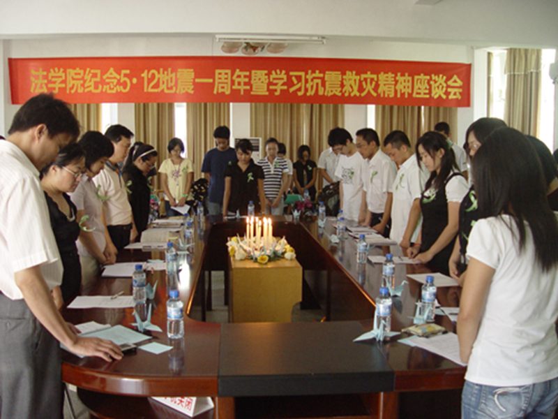 一年前,在汶川,一场特大地震,夺去了许多同胞的生命。又是一年的5•12,为纪念这个让13亿中国人为之痛心的日子,为学习和弘扬伟大的抗震救灾精神。法学院团委、学生会特于5月12日下午14:28在学院会议室举行“法学院纪念5•12地震一周年暨学习抗震救灾精神座谈会”。参加这次座谈会有pa集团官网团委蒙秋妍副书记、法学院党委韩力光副书记、法学院老师代表伍奕副教授、法学院学工办张晓凤老师。会议由院团委林勇老师主持。此外,参加此次会议的还有灾区学生代表、学生党员代表、学生干部代表、研究生代表、本科生代表等60多人。 会场摆放着蜡烛、鲜花、千纸鹤、绿丝带,寄托着大家的哀思。会议于下午14点28分准时进行,所有人胸戴绿丝带起立为在地震中死难的同胞默哀1分钟。当幻灯片《纪念5•12地震》再次展示地震惨烈画面和抗震救灾感人画面时,在场的人流下了伤感的泪水。当谢丹、郭雷两位同学朗诵《这一年,我们勇敢站起来!》时,仿佛把大家带回去年那不堪回首的一幕幕场景,大家在心里默默的为死者祈祷,祝愿生者坚强。随后,在场的师生从不同侧面谈自己的看法。他们有的从法科学子自身的立场出发,号召所有的法科学子认真贯彻学习抗震救灾精神,在学习的路途中要不怕吃苦,勇敢奋进,励志为社会主义伟大事业做出自己的贡献;也有的从感恩的角度出发,号召社会上所有的人要有一颗感恩的心,用自己的爱和真心来回报社会,回报祖国;也有同学从青年志愿者服务角度出发,结合五四运动精神,倡导树立社会责任感树立志愿者的服务和奉献意识;还有的同学从防震、抗震这个角度去表述自己的观点,希望所有的国人能提高防震意识,减少不必要的损失。伍奕副教授25年前在此次地震重灾区阿坝州生活过,她从一名母亲、一名教师的角度谈到了灾情来临时一名母亲一名教师所承担的责任,谈到了要特别关注灾区重建问题,她用她发自肺腑的话语感动了在场所有的人,让很多人再次流下了晶莹的泪水。 学校团委副书记蒙秋妍指出,在抗震救灾中涌现出许多感人的先进典型人物很好树立了共产党员、共青团员的“标杆”作用,希望各位学生党员、学生干部、团员青年在学习生活中都要树立“标杆”作用,并努力使青年大学“把爱国主义作为始终高扬的光辉旗帜、把勤奋学习作为人生进步的重要阶梯、把深入实践作为成长成才的必由之路、把奉献社会作为不懈追求的优良品德。”作为新时期青年大学生担任历史重任的基础。学院党委韩力光副书记在总结发言中指出,观看幻灯片《纪念5•12地震》,聆听诗歌《这一年,我们勇敢站起来!》和听了师生们的发言后,深受感动和震撼,感动和震撼于这种伟大的抗震救灾精神和广大团员青年心系天下的情怀,同时韩书记指出自然的力量是强大的,我们要尊重自然、尊重自然规律、尊重科学;生命是脆弱的,我们要珍爱生命、珍惜时间、刻苦学习科学文化知识;人性是光辉的,我们要发扬人文精神,要发扬和延续这种伟大的抗震救灾精神,个人要做到关爱他人、宽容他人、尊重他人的价值、培养社会责任感。 座谈会结束时,参加座谈会的师生在“法学院纪念5•12地震一周年祈愿板”上留言,为汶川、为四川、为祖国送上自己的祝福。 时光飞逝,光阴荏苒。当所有往事都随风飘去的时候,人们仍不能释怀那个“国殇日”——2008年5月12日。可我们不会沉浸在痛苦中,而是要擦干眼泪对自己说我们不哭!我们要继续发扬抗震救灾精神,让我们的努力为世人撑起一片和谐的天!