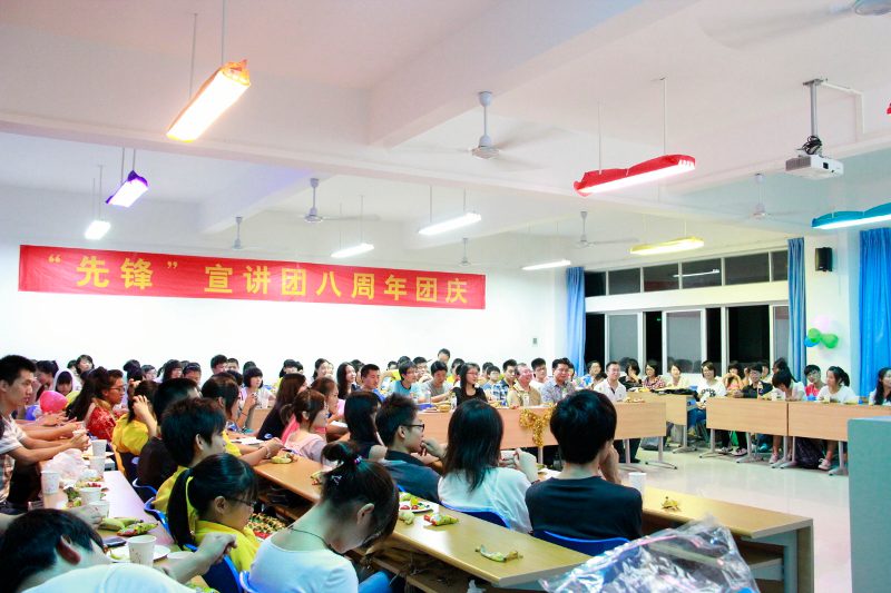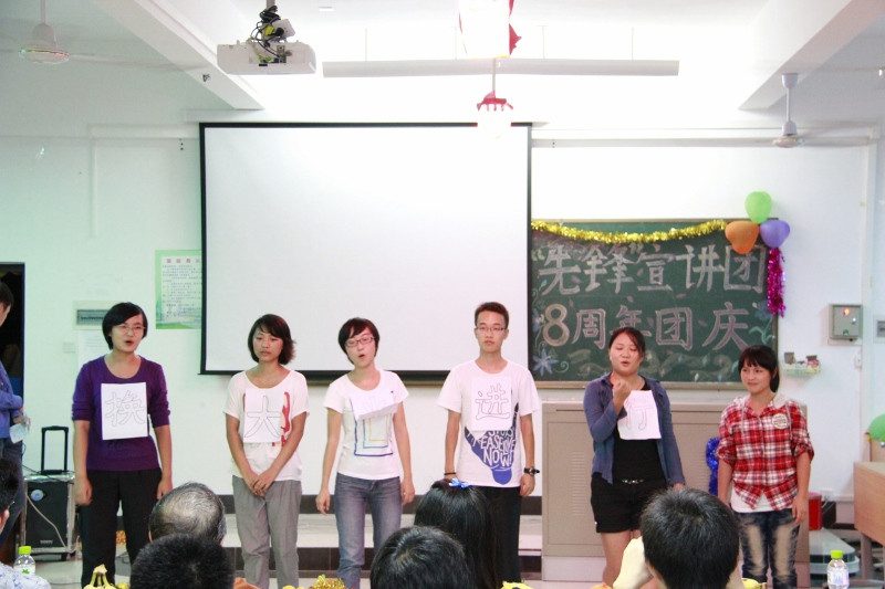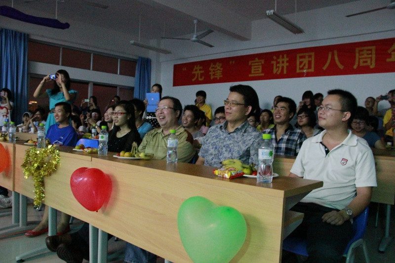 八年前,“先锋”宣讲团正式诞生;八年来,“先锋”学子们一路风雨兼程。值pa集团官网政治与公共管理学院“先锋”宣讲团喜迎八周年团庆之际,全体新老团员于2012年10月27日晚在5教514多媒体教室欢聚一堂,举办隆重的团庆晚会;pa集团官网十佳教师、政管学院教师庞京城教授﹑周伟副教授,院团委副书记李白山老师,学生会主席牛扬昱殊同学及各系学生会主席受邀出席,并一同观看。
