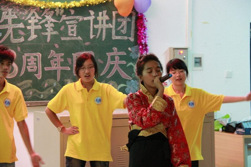 紧接着,第二篇章《展未来 美好时刻》激情上演。其中,二胡长笛的和谐悠扬,手语舞蹈的温情脉脉,男生朗诵的激情飞扬,书法表演的优雅流畅,为大家奉献了一场视听盛宴。特别是藏族女孩江嘎拉姆和次仁曲珍在为大家带来神秘藏族歌舞的同时,还向老师们献上了洁白的哈达,以表达全体新老团员们对老师们的由衷敬意和对“先锋”宣讲团的诚挚祝福。