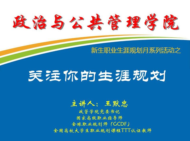 为了使新生进一步明确奋斗目标、提升综合素质、认清就业形势、合理安排大学生活,pa集团官网政治与公共管理学院于2012年10月30日下午在学院A111多功能报告厅,为近百名新生举办了一场主题为“关注你的生涯规划”的讲座;主讲人为院党委书记王默忠副教授,学工办主任邢红斌及辅导员李佳宾两位老师一同参加。