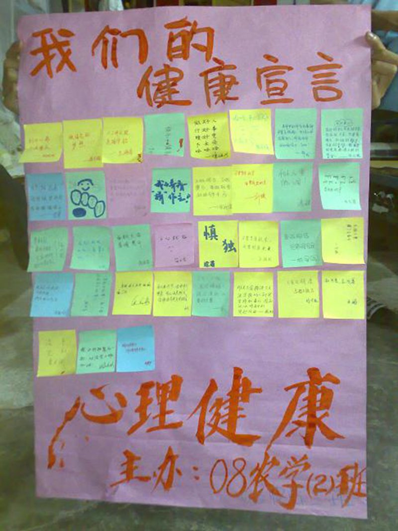 5月17日下午,农学院08农学2班在2302教室开展了一场别开生面的心理健康教育主题班会活动。此次班会特别邀请了学院见习辅导员张建波老师到现场作指导。张老师以自己的切身经历,针对同学们在大学期间遇到的一些心理问题以及如何正确解决这些问题,调适好自己的心态作出了解答和说明。张老师激情洋溢的讲解激起了大家的共鸣,不时引来阵阵掌声。随后,杨茂霞同学与大家分享了她从网上查到的许多关于心理健康的知识,对于大家在学习、交友、家庭、爱情等方面可能遇到的问题进行了阐述,并且提出了相应的解决办法,化解了同学们心中存在的困惑。最后,在班委的组织下开展了“批评建议”和“心理宣言”活动。班委提前做好准备,制作了一份表格,每份表格上有随即10个名字,每位同学发一份表格,在表格上写下那10个同学的不足之处,交上来后班委把表格撕开,将批评建议按名字发到同学手上。通过这一活动让同学们认识到自己的不足,使同学们能针对自己存在的缺陷进行改正。同时,每位同学也都写下自己的心理宣言,贴在宣传纸上。这次班会大家听得认真,写的仔细,学习氛围很浓,每个人都有一份不小的收获。