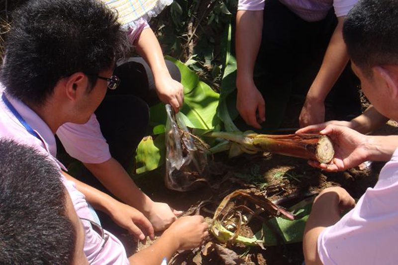服务团还设立了专家和大学生咨询点,一乡亲拿着他从田间里带来的病株焦急地与专家们讨论病因。为有效地解决实际问题,专家和大学们还在乡亲的带领下直接到了他们种植的百亩香蕉地,实地察看香蕉生长情况,经对病株的标本采集观察,在生长两个月的植株上发现了巴拿马病。