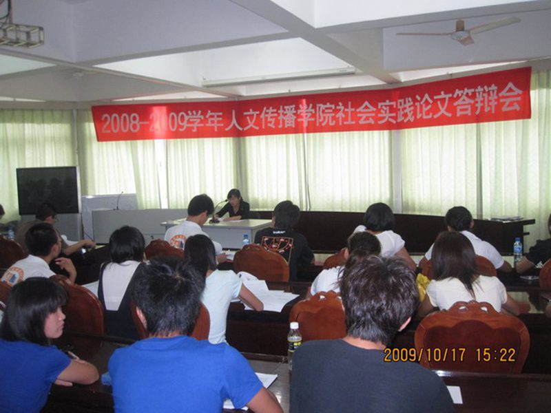 10月17日下午3:00,人文传播学院社会实践论文答辩会在学院二楼会议室成功举行。此次答辩会由广告系安华涛老师和中文系高智老师担任评审,主要对学院开展暑期社会实践的各课题小组的成果进行考察,以帮助同学们提高科研能力,加深实践体会,进一步提高社会实践论文的质量。我院的两个创新课题也参加了答辩会,课题组成员认真听取了评审老师的意见,为进一步修改完善创新成果提供了前提条件。 答辩会在严肃但不失诙谐的气氛中进行。主持人介绍本次答辩会的程序和注意事项后,18个社会实践课题小组分别就各自在暑期社会实践中的成果、经验教训和感想等进行了汇报,并认真聆听评审老师提出的问题,做出了令人满意的回答,一次又一次博得在场老师和同学们的掌声。评审老师在对各实践课题小组的成果提出改进建议的同时也给予了他们肯定,不断赞扬同学们的实践成果有价值。在此次答辩会上,特别是由08级广告学专业的徐飞等同学的《海口市公交运营状况调查》课题,条理清晰、细致入微,充分展现出现代大学生的潜力和积极的态度,老师们对此课题给予高度评价,并希望同学们能够相互学习、取长补短。答辩会的最后是老师为各组打分,各实践课题小组都取得了令人满意的成绩。 此次答辩会圆满成功,充分展现了人文学院的学子风采,也为下次社会实践的成功举行奠定了良好的基础,学院的学生社会实践工作必将会再上新台阶。