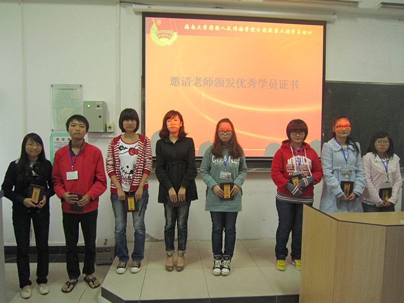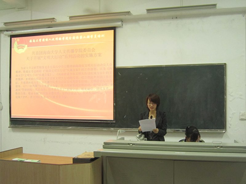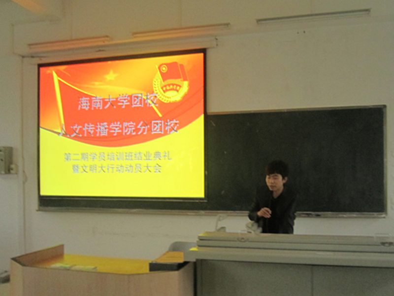 团委书记谢庚全老师首先对本次团校培训做出总结并对我院“文明大行动”的开展做了动员讲话,明确了团学成员今后在学习和工作方面的任务,令大家对未来工作充满信心,同时也号召大家在全省大力开展文明大行动,全校努力迎接211评估的背景下,奋发有为,争当先锋,充分发挥学生干部排头兵的模范带头作用,为全省文明大行动的开展、海南国际旅游岛建设、海大211建设贡献青春力量。