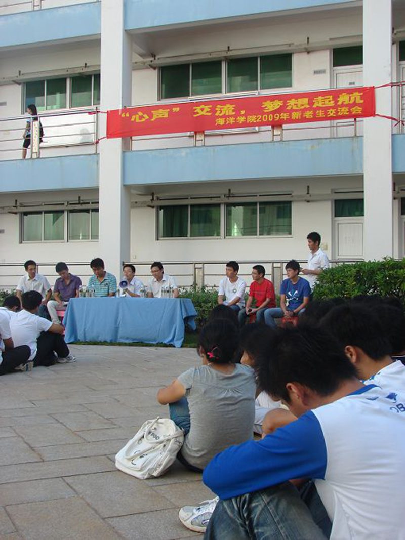 2009年11月10日下午,“‘心声’交流 梦想起航 海洋学院2009年新老生交流会”在海洋学院成功召开。出席本次交流会的前辈有:校团委林琛老师,海洋学院团委书记王林桂老师,第七届海洋学院学生会主席任暾,第七届海洋学院学生会副主席温华茂,前任科技协会会长,2008年“小挑”银奖得主曾南春,07级海洋科学邵锡斌和李海以及07级制药工程李星。海洋学院09级新生全部到场参与交流会。
