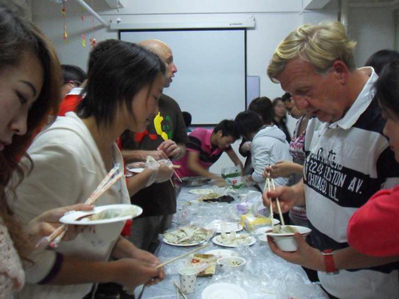 12月5日晚6:30,人文传播学院与国际文化交流学院共同举办了“包饺子煮腊八粥”品尝中华传统美食的学生联谊活动在留学生楼1号教室举行。人文传播学院团学干部、部分同学、外教以及国际文化交流学院的留学生参加了本次活动。 首先,人文传播学院团委办公室主任韩剑丰宣布活动开始。伴随着轻快的音乐,主持人谭中惠、王琪阳用英语解说饺子和腊八粥的背景文化。紧接着,大家便热火朝天地忙了起来,我院学生此时大显身手,有的和面、擀皮,有的包饺子,有的煮起了腊八粥,动作娴熟、有条不紊;留学生们在解说员的指导下,也包起了饺子,虽然有点手忙脚乱,但他们小心翼翼地拿着面皮,一脸认真地学习着。不一会儿,饺子下锅了,此时同学们都兴奋不已。在大家热情的感染下,饺子出锅了,同学们品尝着自己的劳动成果,吃地不亦乐乎,留学生和外教也熟练地用着筷子,纷纷竖起了大拇指,场面热闹非凡。 这次活动在大家的欢声笑语中圆满结束。本次联谊不仅让同学们在动手中享受了快乐,让留学生和外教亲身体验了中华传统美食文化,更为我院学生与留学生的交流搭建了一个很好的平台,增进了彼此的友谊,让双方对学习异国文化有了更浓厚的兴趣。