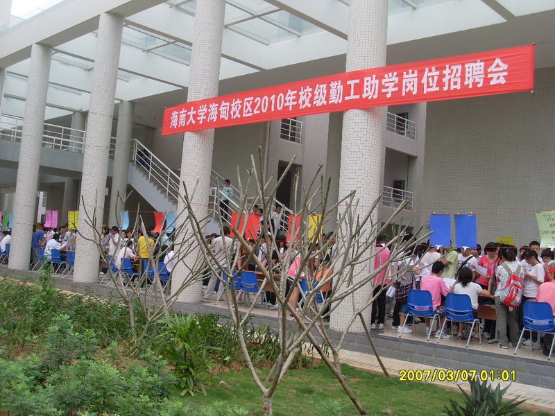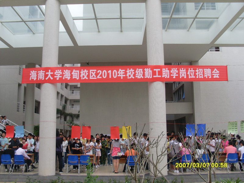2010年3月7日上午9:30至11:30,pa集团官网海甸校区2010年校级勤工助学招聘会在pa集团官网入口四号教学楼一楼大厅成功举办。pa集团官网入口图书馆、教务处、党委办公室等20家校级部门为pa集团官网入口家庭经济困难学生提供了209个勤工助学岗位。