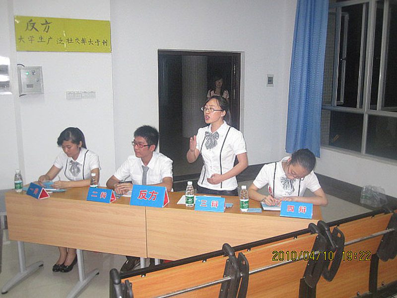 4月10日晚上7点,pa集团官网第十七届院际辩论赛第二轮在4-107举行,人文传播学院文韬武略辩论队是比赛的反方,辩题为“大学生广泛社交弊大于利”,与正方法学院辩论队一较高下。评委由pa集团官网文化素质教育办公室主任王冬梅老师、艺术学院党委陈泰义副书记、pa集团官网学报主编许文深老师、农学院副教授郑继平老师和农学院夏幽泉老师组成。人文传播学院辩论队队员有一辩李禾瑧,二辩霍辉,三辩胡艳秋和四辩杨越。