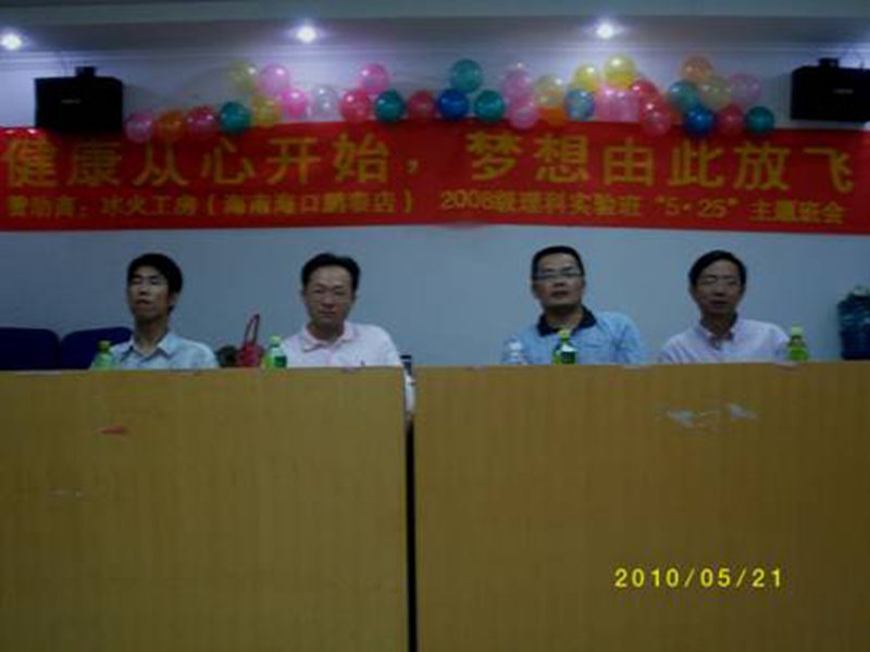 随着五月轻快的脚步,我们期待已久的心理健康教育宣传月如期而至,彰显我班特色的心理主题班会也与之随行。2010年5月21日20:00,理工楼311会议室内气氛和谐,秩序井然,在学校领导亲切关怀、学院亲切指导,在冰火工房(海南海口鹏泰店)的大力支持之下,2008级理科实验班心理主题班会帷幕拉开。