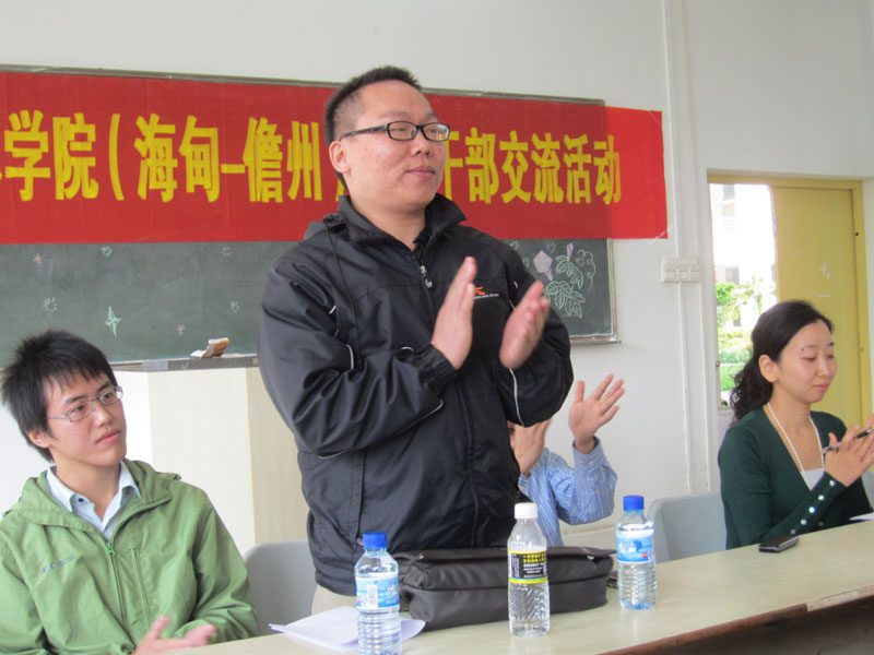刚下车,儋州校区的同学们就受到了我院海甸校区团学干部代表的热情迎接,并带领儋州校区的同学们游览了校园。接着,举行了“海甸——儋州学生干部座谈交流会”,会上,王珍书记、团委彭发万和李丹老师分别作了热情扬益的发言,阐述了此次活动的目的是希望能促进交流,加深两校区之间的感情,老师们亲切的笑容和话语很快就消除了大家彼此间的陌生感,活动在融洽的气氛中进行着。两校区的干部代表也分别介绍了各自团学机构的工作近况。然后,我们进行了自由交流谈论,。