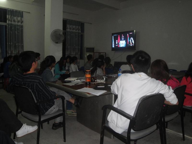 当晚八点,环植学院团委以“感受亚运,传递激情”为主题召开11月团组织生活会,环植学院团委书记姚天增老师、团委各部门学生干部以及各专业班级团干一起在学院会议室观看广州亚运会开幕式。唯美的水上画面,三维立体的表演,点燃圣火的喜庆方式,让与会的35名团干不禁感叹伟大的中国力量。