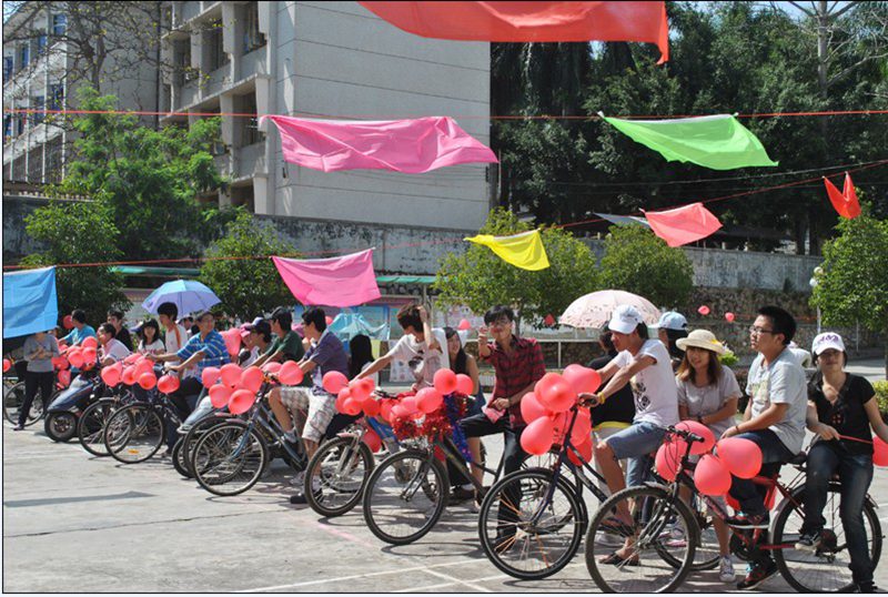 3月6日下午14:50分,各班级由男女生组成的花车代表队齐聚A6草坪,蓄势待发。随着主持人的倒计时,男孩子们跃跃欲试,当“零”响起,各代表队骑着花车勇往直前向前冲,为自己载的女生抢夺代表祝福的玫瑰花。女生们开心的笑着,坐着彩车由男生载着从北门出发绕过校园的每条街道一路骑往东门,青春的活力与激情、欢快的笑声、爽朗的歌声洒满了儋州校区的每一个角落。游园结束后是花车接力赛,各班出五男五女进行自行车比赛。首先由一名男生骑车带一名女生由一端骑到另一端,接着由下一个男生带女生骑回去,依次直到所有人都骑完。各代表队激情澎湃、信心满满,男同学载着女生们一路喊着口号,宣告着必胜的决心冲向对面的同伴。七彩女生 温馨祝福