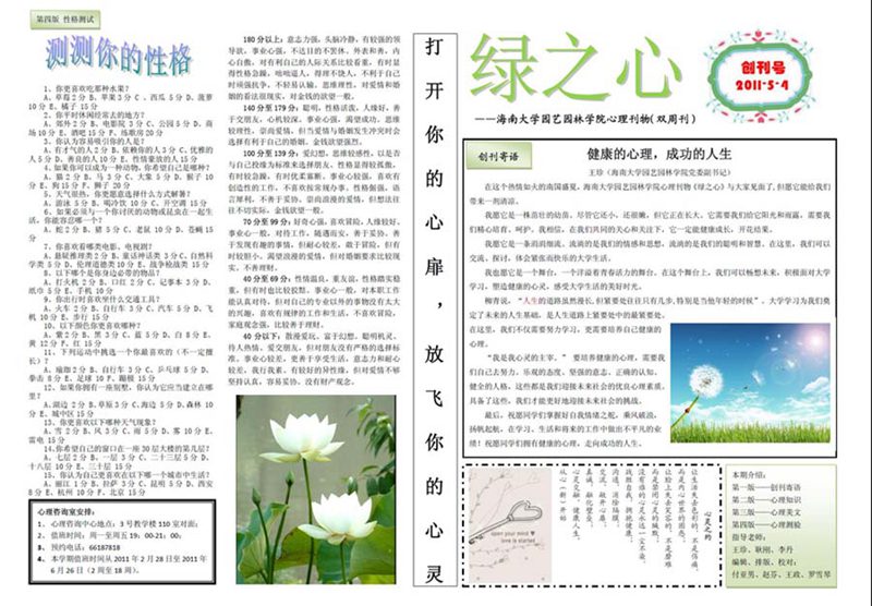 值此一年一度的pa集团官网“5•25”大学生心理健康宣传活动月拉开帷幕,园艺园林学院推出了一系列丰富多彩的活动。按照学校有关文件精神,在学院党委的领导下,经过一系列的精心的筹备和策划,园艺园林学院心理刊物《绿之心》于5月4日终于与大家见面了, 其内容包含了“心理知识”、“心理美文”以及“心理测试”、“班级动态”、“心情日记”等诸多精彩丰富的板块。它的创刊标志着园艺园林学院心理健康教育工作的一个新的开始。为进一步加强和改进大学生心理健康教育,广泛宣传普及心理健康知识起到了一定的推进作用,