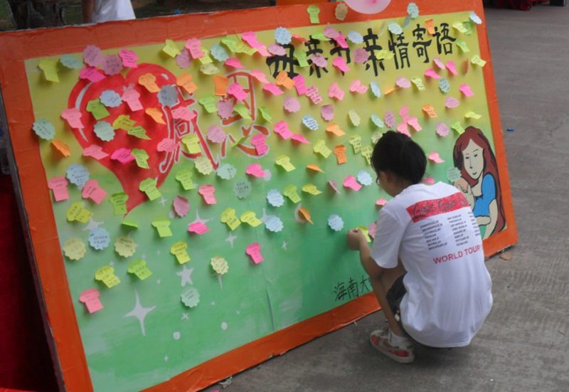 活动于10:00准时开始,本次活动以激发学生对母亲感恩之情,学会与父母沟通,及时传达心中的爱意和祝福为目的,活动得到了校区广大学生的大力支持。活动以一首《听妈妈的话》为背景音乐,阳光下随风摇摆的彩色气球,面带微笑的工作人员们,以及温暖的背景音乐使路过的同学们驻足。为母亲写祝福的同学挤满了工作台,给妈妈打电话的同学也排起了长队,同学们对母亲的祝福贴满了我们的宣传板。这些充分体现了同学们对母亲的爱。最后活动在一曲《妈妈》的音乐声中结束。